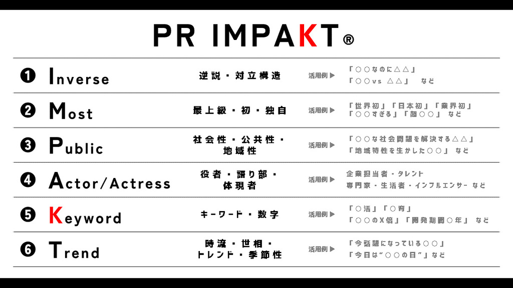 今回は、企業活動やコミュニケーションにおいて、情報設計の際に活用できる6つのポイント「PR IMPAKT®️」をご紹介します。