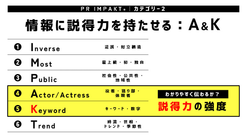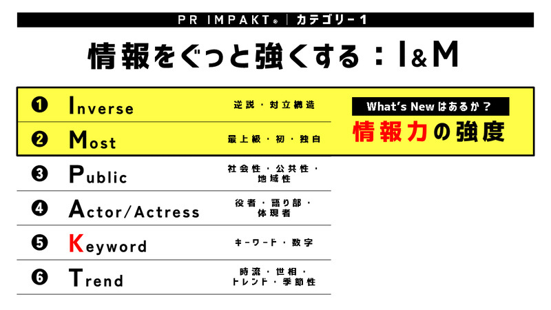 「PR IMPAKT®️」の中でも、文字通り“インパクト”を生む、最も重要な「情報力の強度」を上げる2つの視点です。それが「Inverse」と「Most」です。6つのうち、最も優先度が高く、発信する情報にはどちらかを必ず入れておきたい視点です。