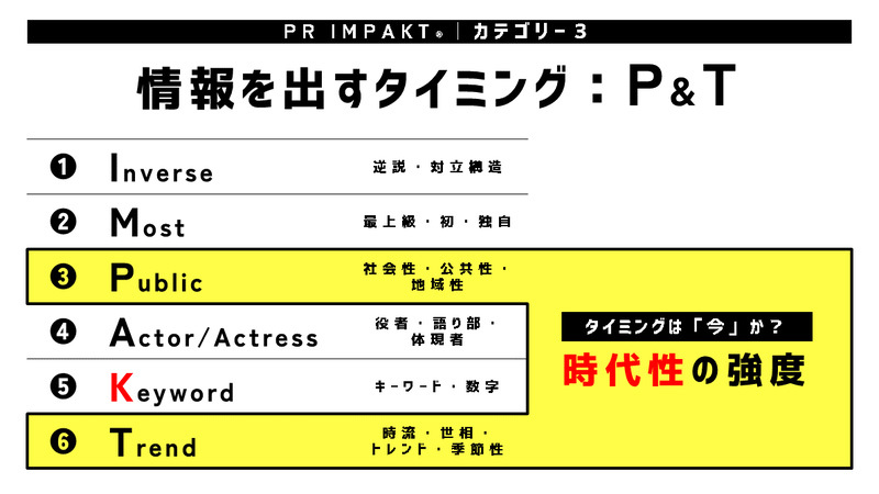 最後のカテゴリーは、「時代の気分」を反映させた視点です。これは、「Public」「Trend」が該当し、端的に言うと「今」というタイミングの必然性が存在しているかです。