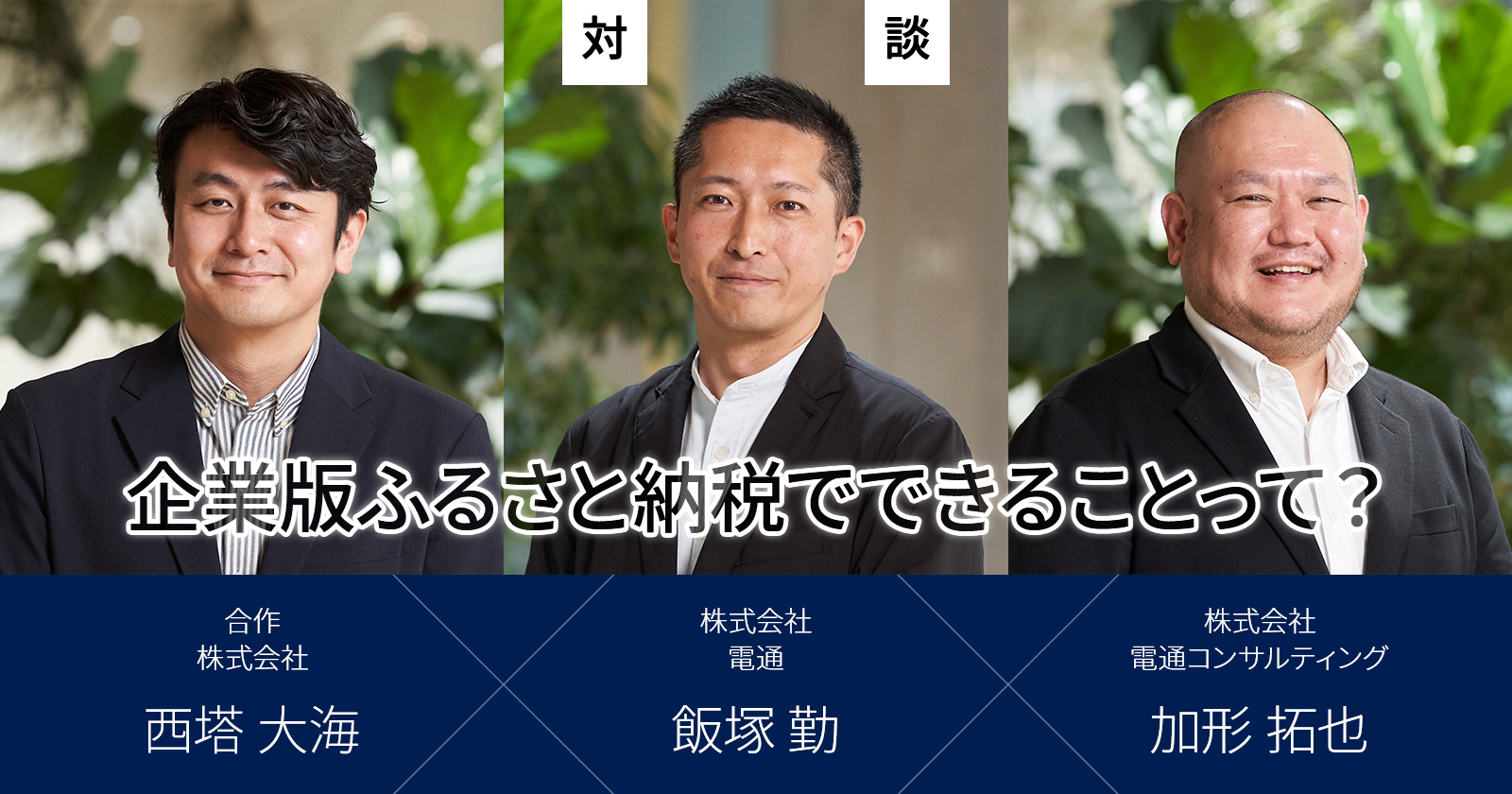本記事では、2023年からスタートした企業版ふるさと納税を加速させる取り組みである「地域共創SXプログラム」を提供する3社にインタビューを実施。株式会社電通コンサルティングの加形拓也氏をファシリテーターに、地域・企業と共に社会課題に取り組む合作株式会社の西塔大海氏と、株式会社 電通の飯塚勤氏が、企業版ふるさと納税を通じた地域貢献について語り合いました。