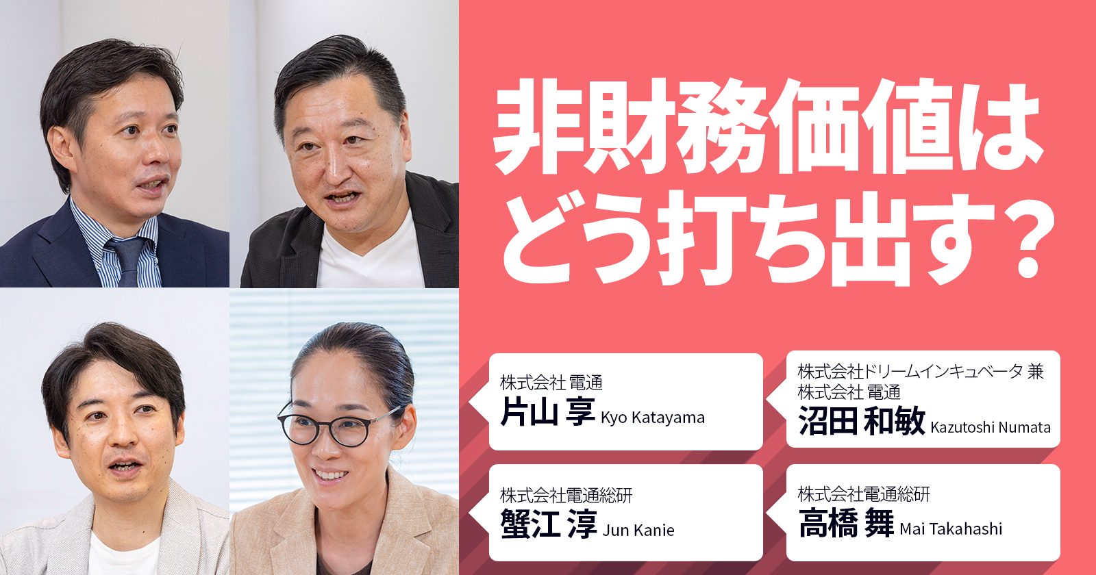 こうした課題に応えるため、国内電通グループ(dentsu Japan )では戦略的IR支援プログラム「IR For Growth 」の提供を開始しました。本プロジェクトに参画する株式会社 電通 トランスフォーメーション・プロデュース局 部長の片山享氏、株式会社ドリームインキュベータ 執行役員 兼 電通 トランスフォーメーション・プロデュース局の沼田和敏氏、株式会社電通総研 コンサルティング本部の蟹江淳氏、人的資本経営案件を数多く手がける電通総研 コンサルティング本部の高橋舞氏へのインタビューの後編では、本プログラムが提供するサービスや、財務・非財務の価値向上の重要性について話を聞きました。